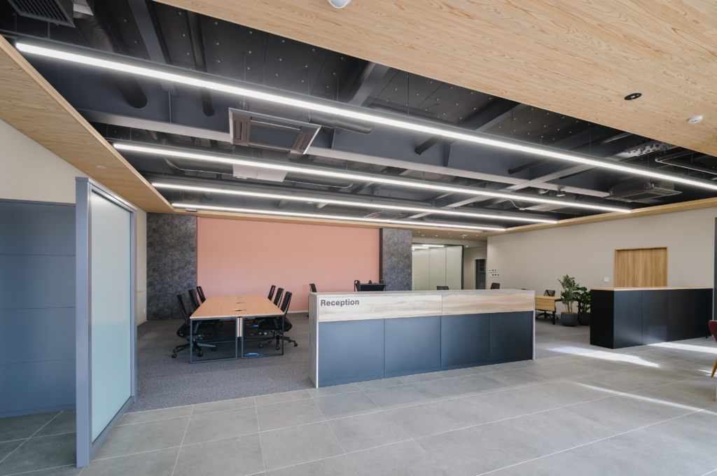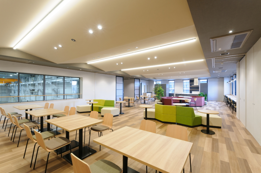 事務所エリアは工場に対してL型に配置することで、事務所エリアから工場・駐車場へそれぞれアクセスしやすい計画としている。事務所エリアの内装は工場らしくない、社員が働きたくなるような環境を目指した。