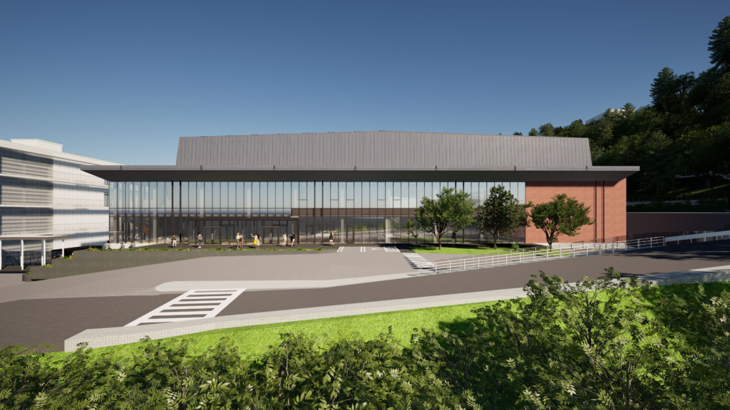 外壁仕上は中学・高校校舎で使用されているレンガ調タイルに色合わせを行った質感のある吹付塗装とし、既存校舎との調和を図っている。また、アリーナの大きなボリュームをトレーニング室や更衣室から構成される2層の低層部で囲い、さらにアリーナ上層部の壁面を勾配のついた屋根形状とすることで、道路側および既存校舎側への圧迫感が低減されるように配慮した計画としている。